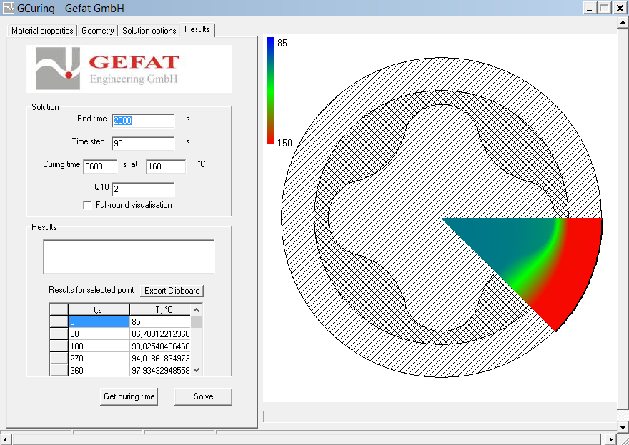 Nach Eingabe der gewünschten Temperaturen wird der Vulkanisationsvorgang grafisch und tabellarisch simuliert.